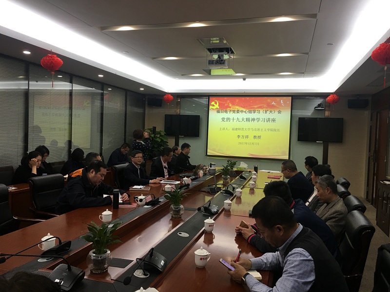 2017年12月7日下午,福日電子以黨委中心組學(xué)習(xí)(擴(kuò)大)會的形式舉辦黨的十九大精神學(xué)習(xí)講座,特邀福建師范大學(xué)馬克思主義學(xué)院院長、博士生導(dǎo)師李方祥教授作了題為《新思想引領(lǐng)新時(shí)代,新使命開啟新征程》的十九大精神輔導(dǎo),公司黨委委員、成員企業(yè)、事業(yè)部副總以上領(lǐng)導(dǎo)、本部助理以上管理人員以及機(jī)關(guān)支部全體黨員近40人參會。