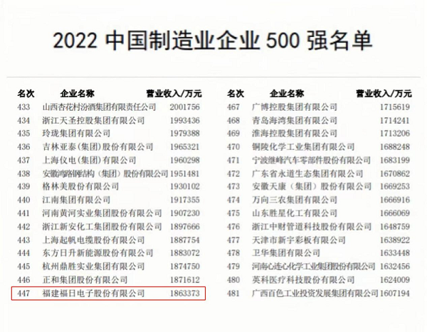 9月6日,中國企業聯合會、中國企業家協會舉行新聞發布會上,向社會發布了“2022中國企業500強”“2022中國制造業企業500強”“2022中國服務業企業500強”等各項榜單及其分析報告。其中,公司首次入圍中國制造業企業500強,位列第447位。